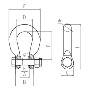 | ITEM NO. | WEIGHT(Kg) | WLL(T) | B.L(T) | A±2 | B±2 | C±1 | D±2 | E±2 | F±2 | L±3 | φ±0.5 | φ'±0.5 | K±0.5 |